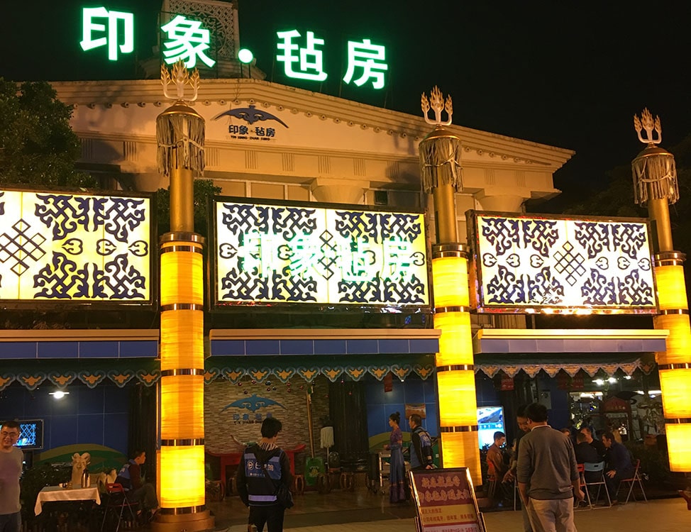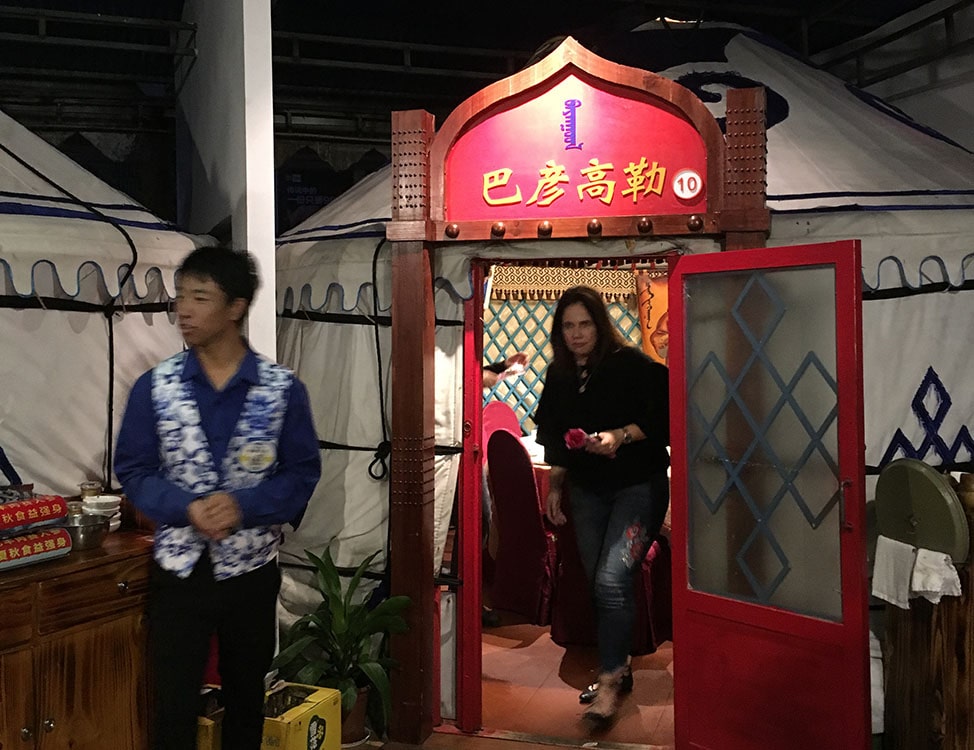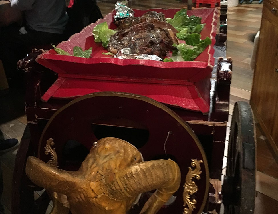 We arrived at this open-air restaurant filled with about 30 private dining yurts and knew we were in for a unique evening. Our yurt fit twelve people around a large, circular table. Our friends had also arranged for a whole lamb. You heard that right, a whole lamb, which was wheeled in on a wooden cart, roasted and falling off the bone. It was my first time seeing meat presented by mini-chariot.