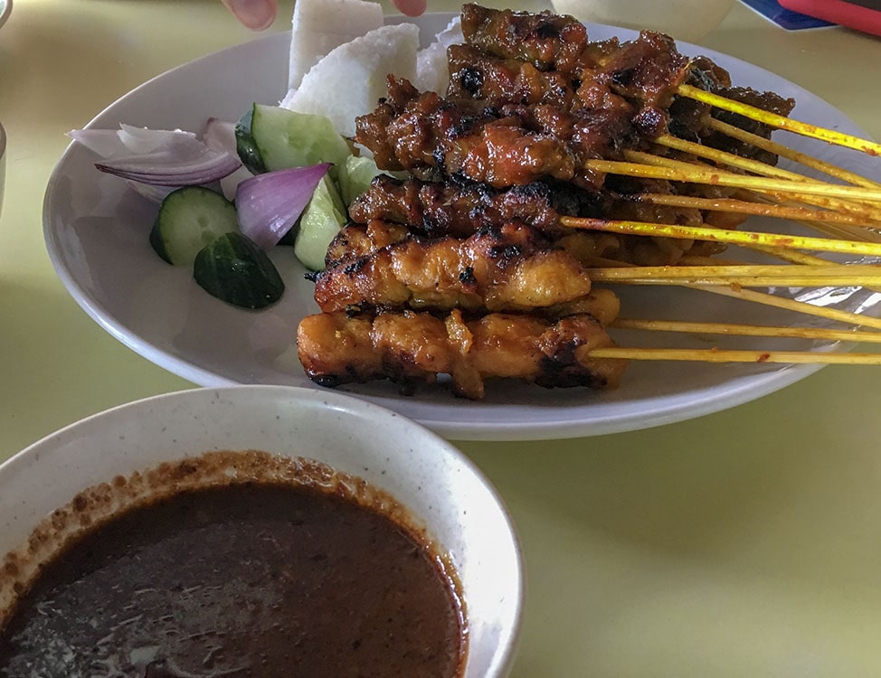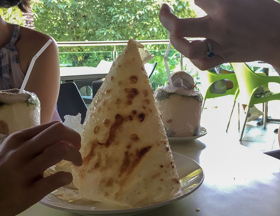 Our friends quickly took to ordering, and we sat on the outdoor patio in the blazing KL summer sun and had the most amazing chicken satay we’ve ever had. The plate was piled high with skewers of the iconic Indonesian street food, with the charred, fatty chicken thigh, glazed in the sweet and savory peanut sauce with a little extra on the side for dipping. Dessert was a towering cone of dosa drizzled with honey and sugar. The thin, almost cracker-like Indian flatbread was made to order, arriving piping hot and glistening with the glaze.