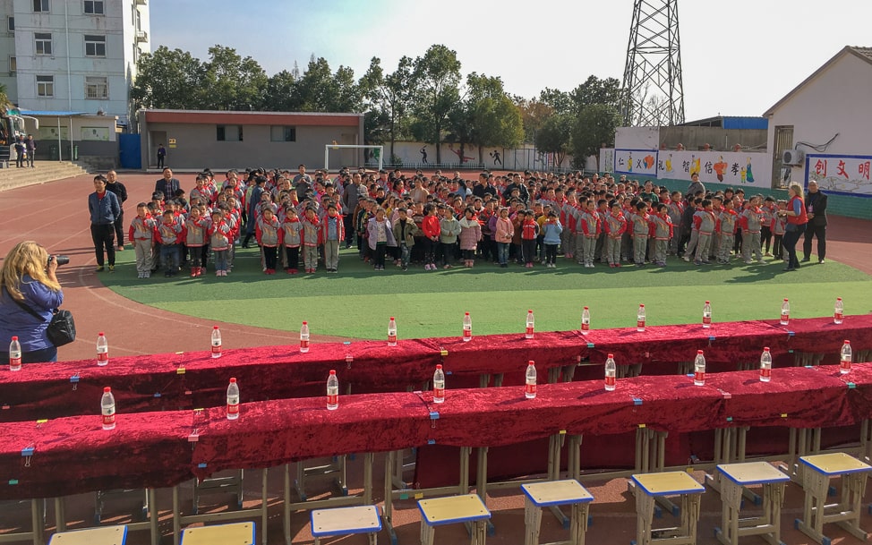 A table with a microphone was setup for a presentation at each school visit. Karen, our executive director, gave a ceremonial speech about our donation of a library. We also brought to the schools dozens of bags of school supplies for each child, plus bags and bags of clothes and toys for them to have. I don’t speak very much Chinese, but I could always hear when Karen was approaching the part in her speech about the bags full of clothes and toys, as all the children started cheering and chatting to each other every time.