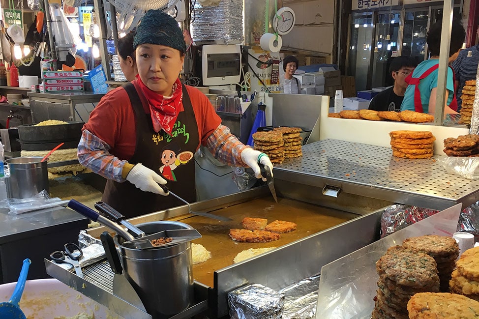 The large, covered market initially sold agricultural and seafood products. As the market expanded, vendors began selling all sorts of items, from household goods to traditional medicine. Eventually, food stalls started popping up to feed the hungry shoppers that descended on the market everyday. Now, the chaotic market is an epicenter for traditional Korean cuisine.