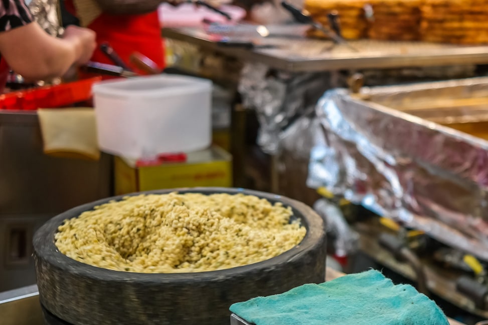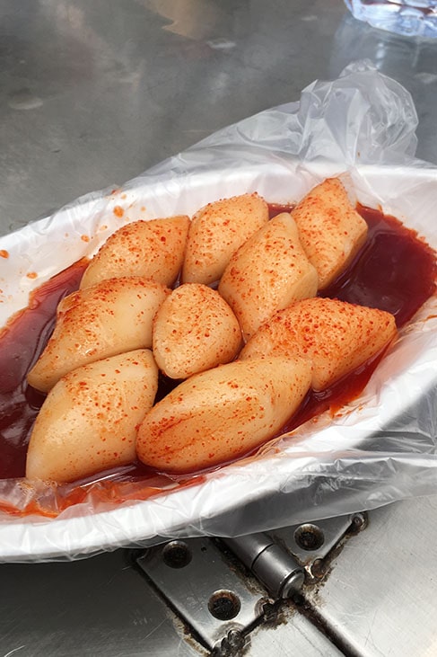 The mayak-gimbap is a Korean version of a sushi roll. This particular kind of gimbap at the market is well known and famed to be addictive, which is why mayak (translated as drug) is added to this variety. The filling is vegetarian, consisting of carrots, spinach, and pickled yellow radish. The addictive part comes with the dipping sauce made from soy sauce and spicy hot mustard. Addictive? Not really. Delicious? Definitely.