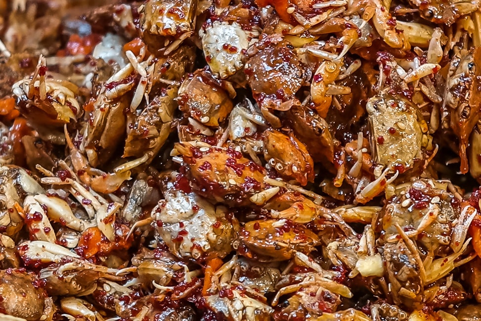 On our way to the final stop in the market, we stopped by a banchan stall, selling dozens of side dishes. Banchan is very popular in Korea, and many restaurants provide at least a few with every meal. At a Korean barbecue, almost a dozen of these tiny dishes will arrive shortly after sitting down. The sampling at this stall was free, so we grabbed a few toothpicks and picked out some items. The lotus root was a bit starchy for my taste, and Julie didn’t love the whole river crab that you eat in one bite, shell and all. Luckily, the other pickles and kimchi hit the spot.