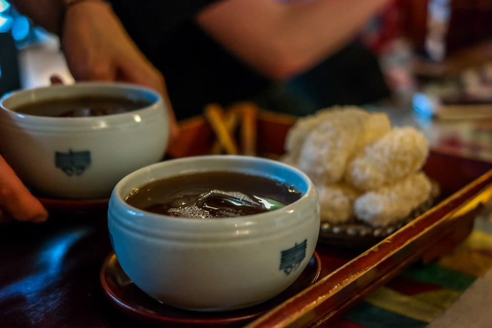 Our final destination on the food tour was a tea house, located down a small lane in Inse-dong. The small building was once a family home that was converted. It had an open-air courtyard with a small garden, and the interior space was dark wood, with floor seating. The teas were unique, and delicious, with the right amount of sweetness to feel like a treat.