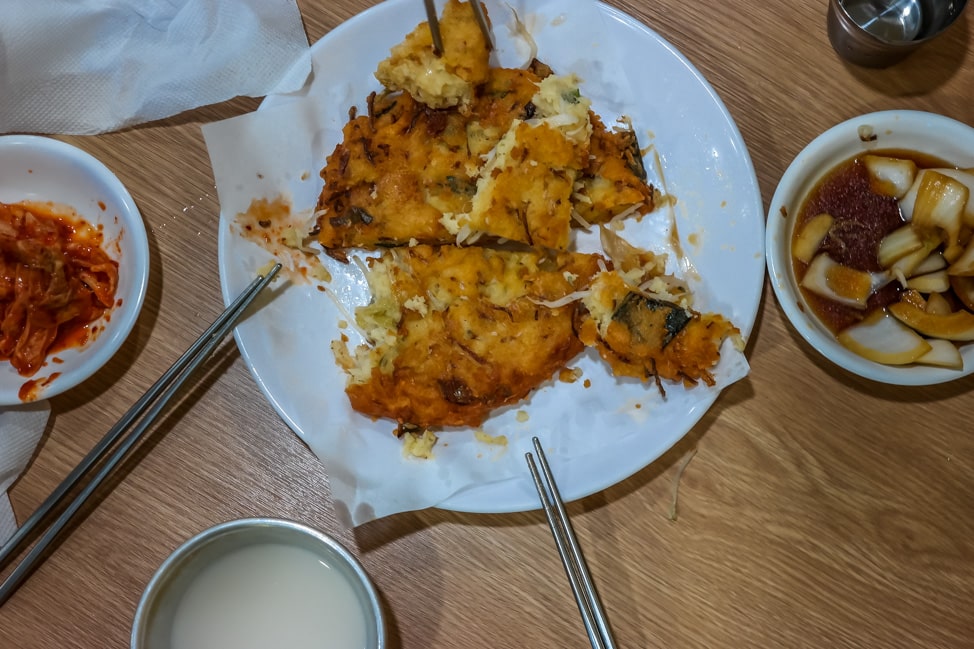 Since this kind of dish is best paired with alcohol, we were provided with a small bottle of makgeoli, a milky, rice-based alcohol. Our guide took the bottle and shook vigiruiously, as the clear liquid become cloudy in the bottle. It was not the most visually appearing cup of rice wine, but the flavor was nice and the acidity was perfect with the fried pancake. Fried food pairs well with booze…who knew?