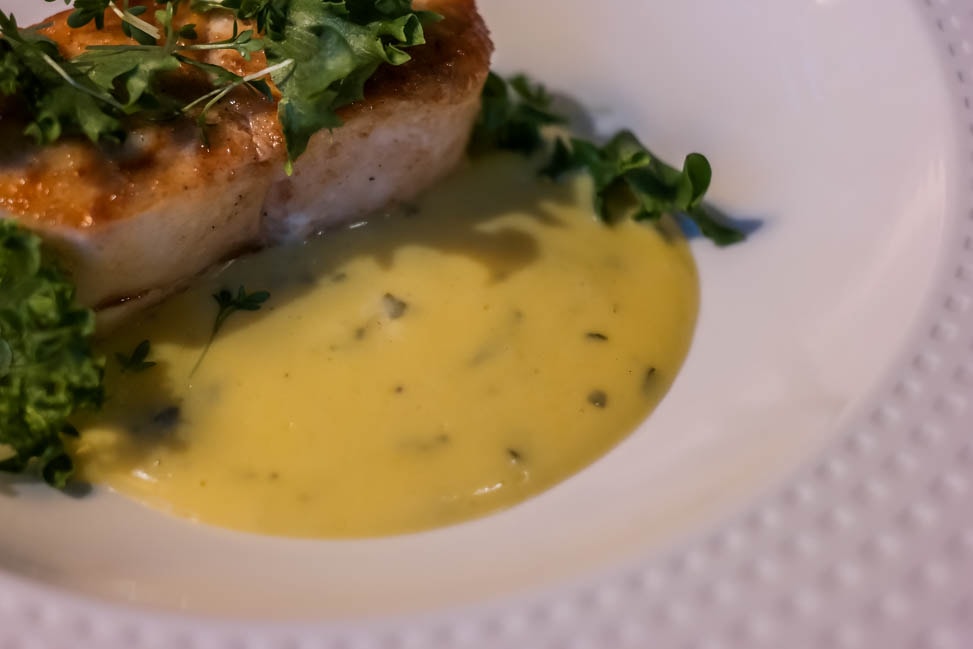 We took our server’s recommendation for all dishes, happy that most of the menu was naturally gluten-free. The server, also the manager, was spot on with her recommendations and we shared two starters and a large main course (meant for sharing). We selected a light white wine to pair with the meal, as it was seafood heavy (more to come on that – if you hate seafood, Oslo is NOT the city for you).